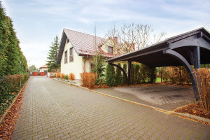 Obok domu znajduje się wiata garażowa o powierzchni 30 m², przeznaczona na dwa auta.